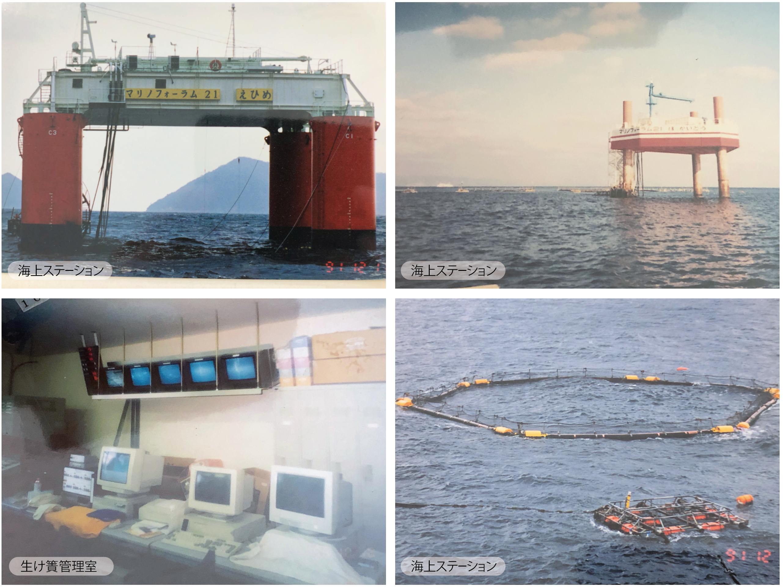 まず養殖管理の第一歩として平成3年生け簀への自動給餌、魚の育成監視を目的に愛媛県宇和島内海で実施されましたマリノフォーラム21事業ハマチ沖合養殖管理に参加し、沖合に建設された海上ステーションから生け簀内のハマチの給餌状況を遠隔監視するシステムとして水中カメラを設置致しました(図2)。続いて平成5年にも同様に北海道奥尻町でサクラマス沖合養殖監視として水中カメラを設置するなど、約30年前から養殖の高度化へ取り組んで参りました。