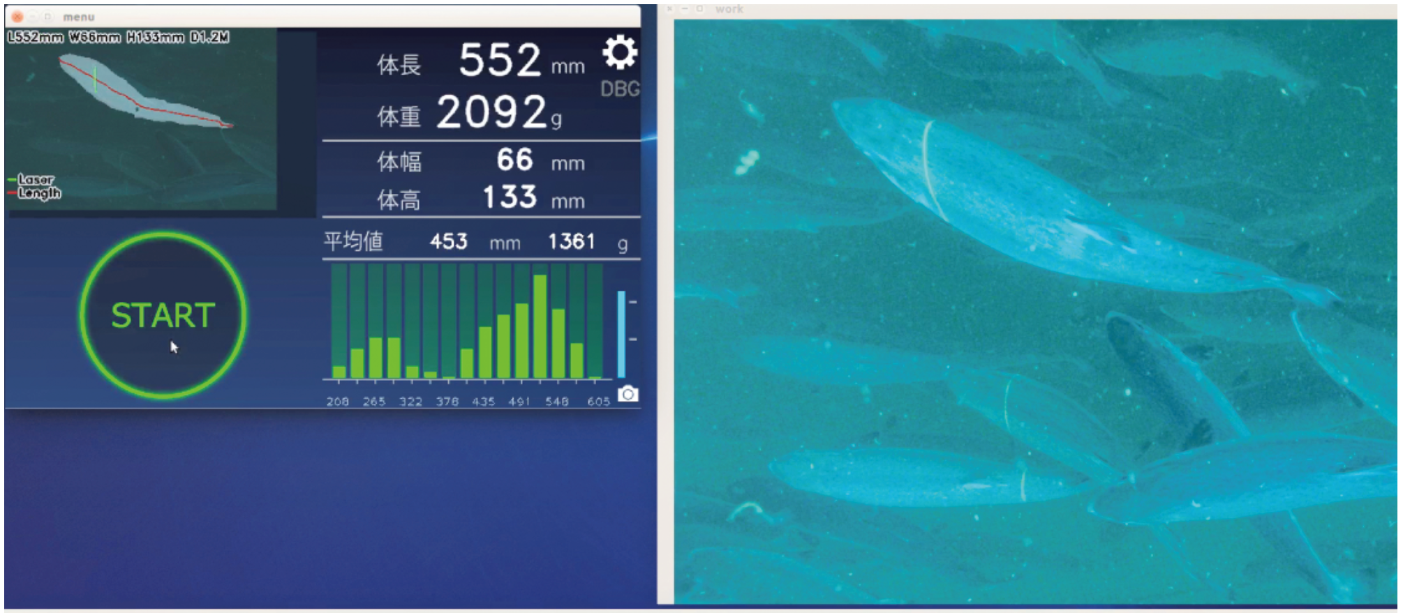 また水中ロボット以外にも音響ソナーでの魚の管理、生け簀内の水中映像の遠隔伝送などより省力化に向けた養殖管理が試みされており、よりIT化に向かっていると考えます。弊社においても魚の育成管理にも着手し、マリノフォーラム21と協力し魚体計測についてのシステム開発に取り組みました。養殖では魚の育成状態は売買価格に影響し出荷のタイミングが重要になってきます。また育成状況次第では給餌量の調整も必要となることから、より効率的な育成が重要となり、魚の成長状況を把握できる技術が確立すればこれからの養殖管理がより高度化へと向かうと考えます。