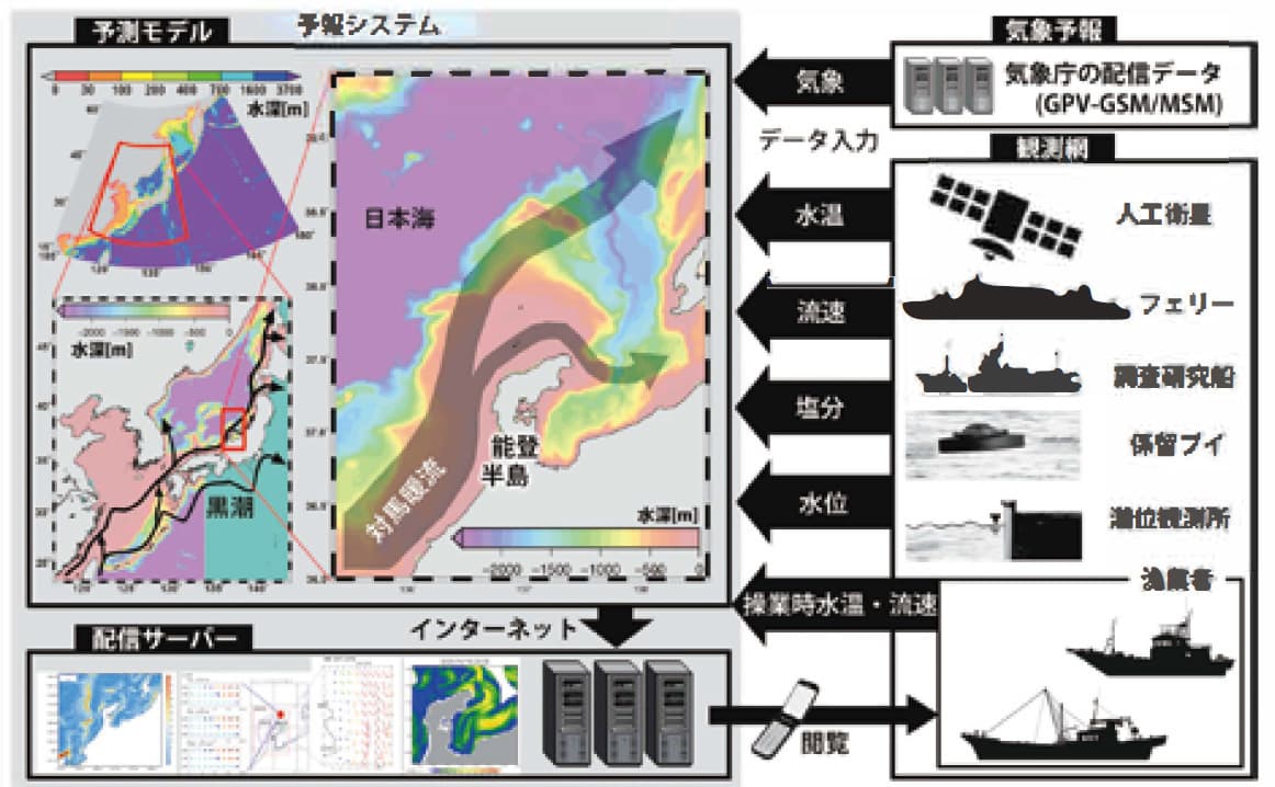 まだ国内ではリアルタイム海況予報システムが発展途上だった頃、2009年頃に遡りますが、その当時は天気予報のようにリアルタイムに海況予報を出せるシステムは国内では存在せず、海況予報システムの研究開発が国内の諸研究機関で進められていました。私が参画したのは、九州大学応用力学研究所の広瀬直毅教授が代表を務めた、石川県能登半島周辺の海域を対象海域とした予報システムの開発でした。これは、好漁場の推定に加えて定置網などの漁具に甚大な被害を与える急潮予測の目的で、漁業者に情報提供するサービスを創出しようとするもので、2012年にはリアルタイム海況予報システムDREAMS シリーズが完成し開業しました(図l)。当時としては、まだスマートフォンの普及が十分ではありませんでしたが、リアルタイムで予測結果を携帯電話(いわゆるガラケー)に配信しており、漁業者が予測結果を操業前にチェックしていたそうです。それだけではなく、図1のように、漁業者に収集していただいた操業時の現場観測データを活用してシミュレーションを最適化することで、より良い予測結果を期待できるシステムになっており、漁業者がデータを収集することにインセンティブが働く仕掛けになっていました。この漁業者と協働できるという独創的な部分が評価されました。この研究では、急潮など気象イベントに起因する物理現象の予測は概ね上手くいったのですが、河川プリュームと呼ばれる降雨時の河川出水による低塩分水の挙動を再現・予測することが難しいこともわかってきました。低塩分水は、沿岸海域に栄養塩を陸から運んできて、ノリなどの生物生産を高めてくれる反面、ウニやカキ、ホタテなどの養殖水産種に悪影響(生育不良やへい死) をもたらすこともあります。低塩分水を常時モニターするための観測体制が不十分であることから、シミュレーション結果の再現性の検証すら困難でした。