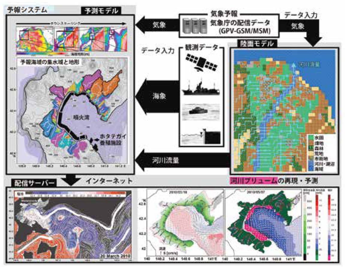 次に取り組んだのが低塩分水、河川プリュームの予測研究でした。そのためには、河川流量予測と海況予測を同時に行う必要があります。当時は河川流量の予測可能なモデルは多数ありましたが、リアルタイム海況予報に実装した事例はありませんでした。そこで、文科省が採択した函館マリンバイオクラスター事業の一環として、北海道の噴火湾におけるホタテ養殖漁場を対象海域にした、陸海域統合シミュレーションによる予報システムの開発に精手しました。この事業では、現場塩分の観測データも多く収集されており、塩分場の再現性検証も可能だと考えました。北海道は積雪地域ですから、融雪出水が河川流量の変動にとって最大のイベントです。したがって、流量予測以外にも積雪・融雪現象を再現するモデルも必要で、それに加えて、計算負荷の軽いコードを作成する必要がありました。試行錯誤の結果、融雪と河川流鼠をある程度再現できる陸面モデルを開発し、海況予測システムに実装しました。図2 は陸海統合シミュレーションの概要を示したもので、右側に陸面モデルを示しましたが、格子状に配置された森林や水田等の土地利用や標高といった地理情報と気象予報を駆使して、河川流量を計算する仕組みを表しています。このようにひと手間をかけて海洋シミュレーションを実施した結果、塩分場の再現精度が約1 0 %向上し、噴火湾内に河川プリュームをうまく再現することができました。こういった海面塩分場の予測結果をひっさげて、噴火湾沿岸域の漁業者さん達にインタビューしたところ、予想以上に興味を持っていただけました。特に”ゆきしろ”と呼ばれる春季の融雪出水のタイミングがホタテ稚貝の生育に影響し、その結果、養殖生産量の多寡を決定するとのことでした。河川プリューム、つまり低塩分水リンクとホタテ養殖業の生産の情報が連関した瞬間でした。ただ、同時に養殖場内のどのあたりまで低塩分水が張り出すのかを詳細に予測できないか?との要望もいただきました。なぜなら、図2 をみるとわかるように、ホタテ蓑殖施設は沿岸にべったりと張り付いたように配置されており、どのあたりにどれくらいの塩分の海水がやってくるのかという情報が、低塩分に弱いホタテの稚貝を養成するためには大変重要だからです。しかし、当時のモデル水平解像度が約1.5km で、養殖場付近におけるきめ細やかな情報を提供するには不十分でした。これ以上解像度を高くすると計算資源が足りず、計算時間が長大になって計算が困難です。また高解像度の再現計算結果が得られたとしても、それがどれだけ正しいのかを検証するための現場観測データもありませんでした。