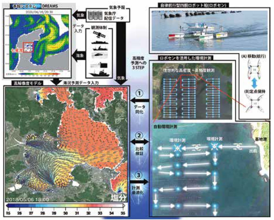 この問題を解決する方向性は、現在も模索中ですが、いくつかの方法を組み合わせることで解決できるのではないかと考えています。方法のひとつとしては、予測モデルの局所的な高解像度化です。マルチスケール分解能モデルとネスティングという手法を組み合わせることで、必要な場所だけを高い解像度で計算可能にする技術を採用してみました。図3左のように、七尾湾ではマルチスケール分解能の予測モデルFVCOM (Finite Volume Community Ocean Model) を導入することで、すでに予報システムとしての地位を築いているDREAMS からの予測結果を利用した、高解像度の海況再現計算が可能になりました。そしてもう一つは、現場観測データを高頻度かつ高密度で収集できる、四胴型自動航行船(ロボセン) を活用して、検証用の観測ビッグデータを蓄積することです(図3 右)。ロボセンは大阪府立大学の二瓶泰範先生の研究室と日本海エ(株)の研究グループが今も研究開発を進めており、現在は七尾湾の西湾にあるマガキ養殖場の周辺海域において、実験的な自動環境計測が実施されています。このロボセンによって収集された現場観測データを使って、FVCOM による高分解能の再現計算の妥当性の検証を始めたところです。従来は、自治体が実施する月1 回程度の硯場観測データや、数点のロガーデータを使って、シミュレーションの再現性を検証するしか方法はありませんでした。ここにきてようやく、裔分解能の海況再現計算結果と比較可能な現場観測データが時空間的に十分に得られそうだという感触を得ています。羞殖漁業者にとっても、これまで培われた長年の経験や勘に加えて、このような科学的データという強力な材料を活用することで、さらに効率的で安定した養殖生産事業に展開できるのではないかと期待しています。今後は、高解像度の衛星画像やドローン空撮画像からの水質マッピング技術を組み合わせることで、これまでに無い多角的な現場観測データの充実を検討していく予定です。このような高解像度シミュレーションと高頻度・高密度の観測ビッグデータを組み合わせた取り組みは、国内外での展開を視野に考えています。