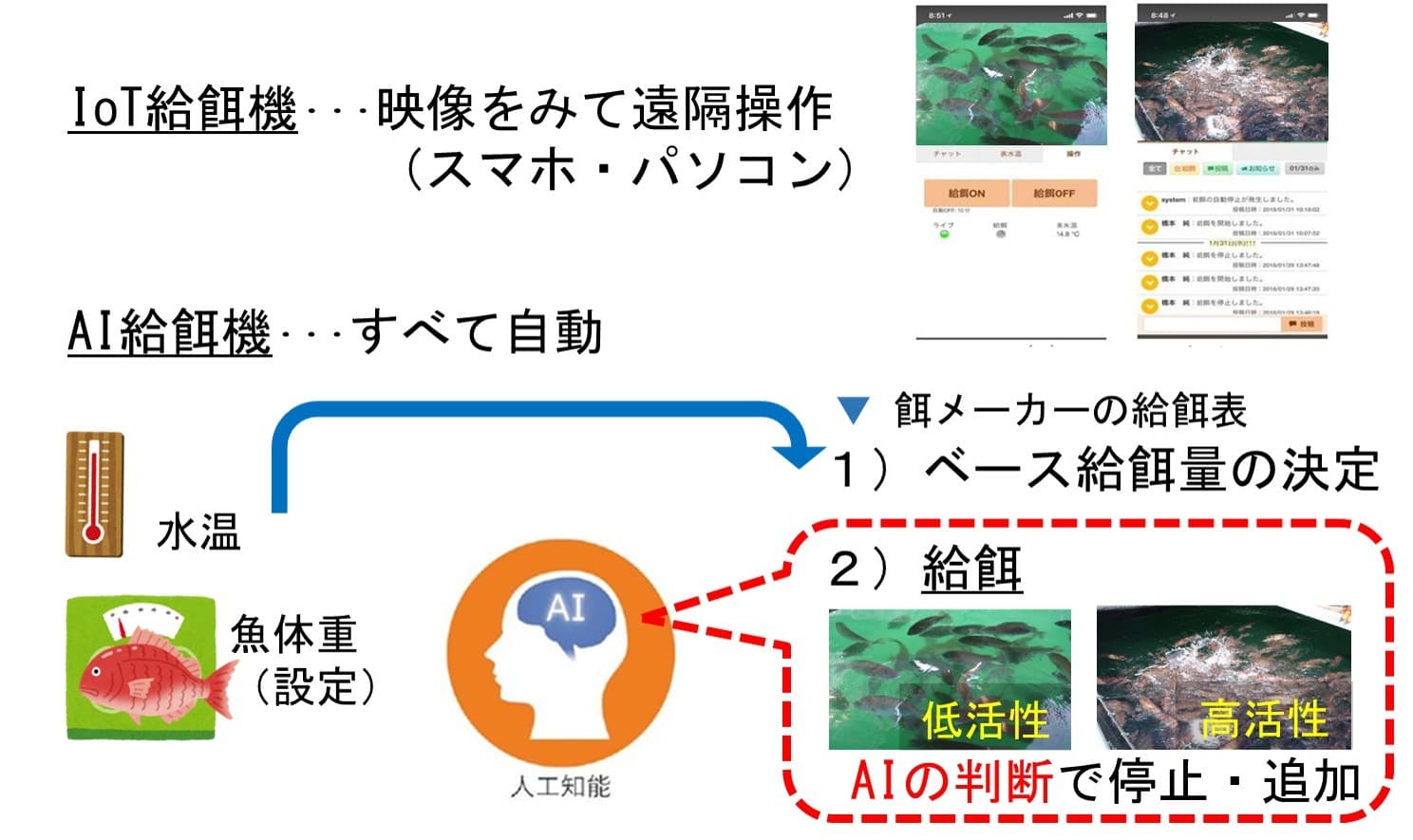 これまでに海面上からのカメラ映像をスマートフォンで確認し、遠隔で魚の摂餌時の活性を見ながら給餌を行うシステム(IoT給餌機)を開発しました。現在開発中の自動給餌システム(AI給餌機)は、餌料メーカー作成の給餌表、つまり水温と魚体重に基づく給餌量をベースに、AIがカメラ映像により魚の摂餌活性を判断して給餌の停止や追加を行うというものです(図4)。