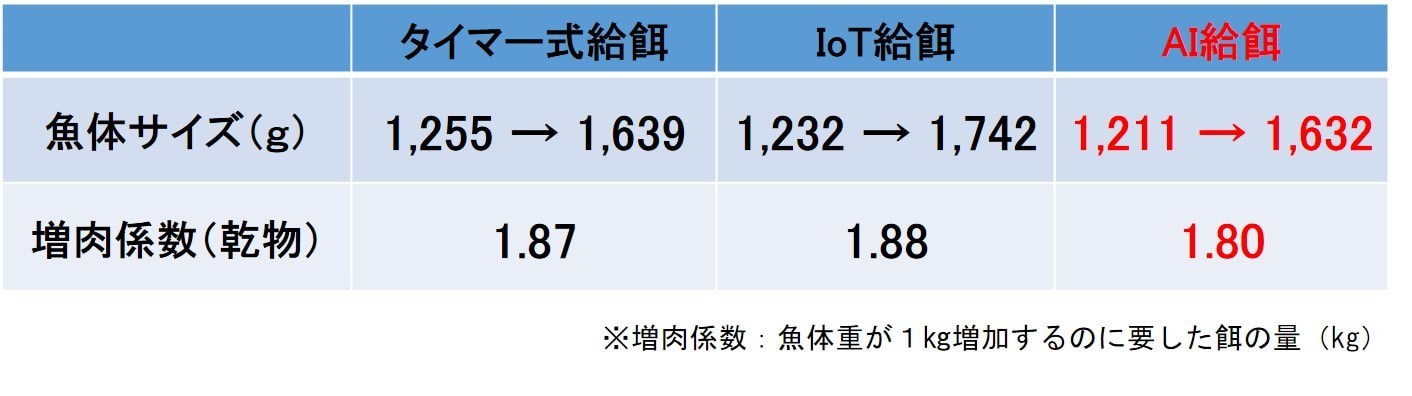 小規模養殖試験の結果、AI給餌機でも、遠隔で人が給餌をコントロールするIoT給餌機と遜色のない試験成績(成長や餌料効率)が得られ(表1)、AIによる完全自動給餌システムの実用化の可能性が示唆されました。今後は、実用規模での試験を行うとともに、養殖現場への普及に向けて、労力面やコスト面での効果の数値化にも取り組んでいきます。