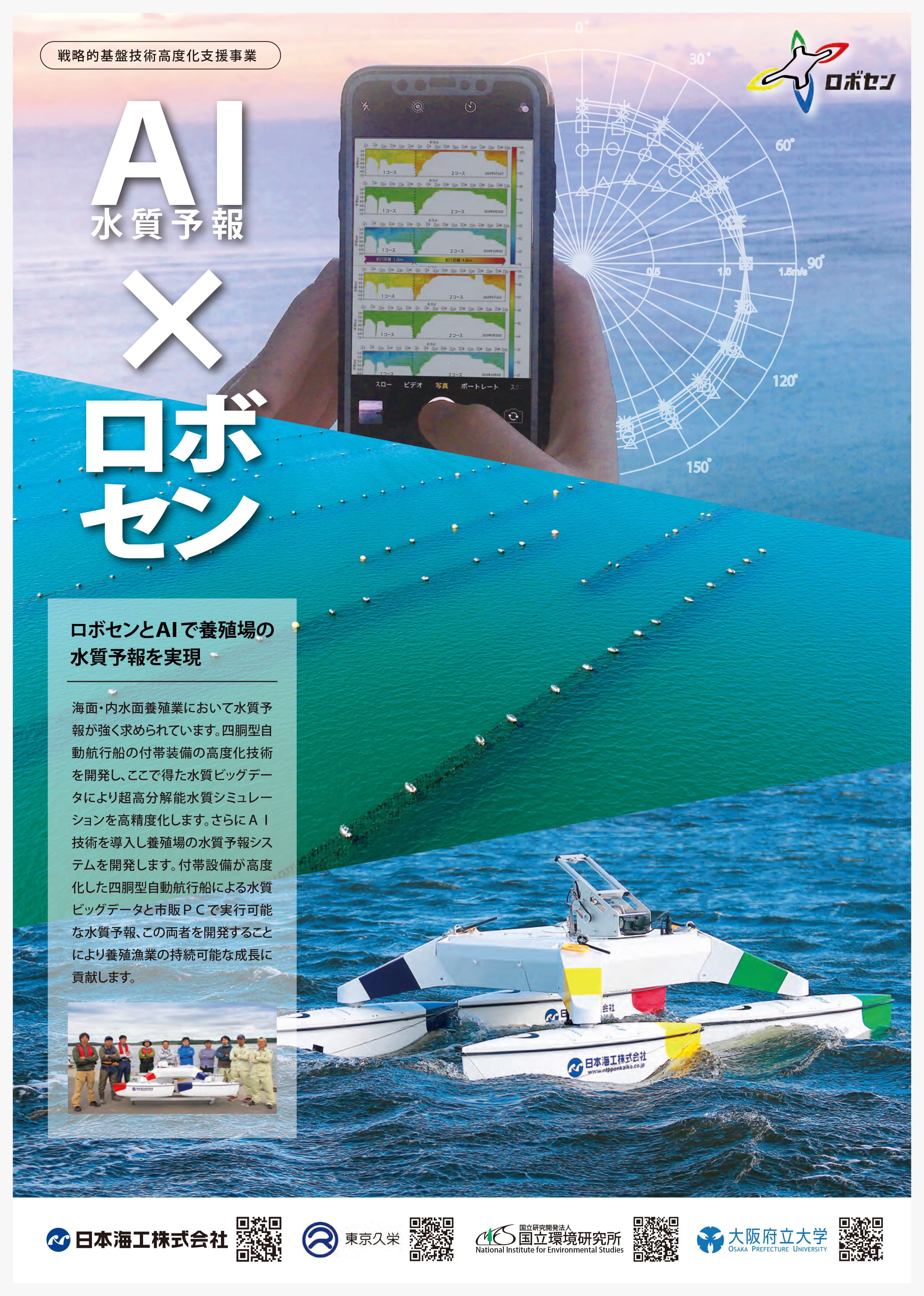 海面・内水面養殖業において水質予報が強く求められています。ロボセンの付帯装備の高度化技術を開発し、ここで得た水質ビッグデータにより超高分解能水質シミュレーションを高精度化します。さらにAI技術を導入し養殖場の水質予報システムを開発します。付帯設備が高度化したロボセンによる水質ビッグデータと市販PCで実行可能な水質予報、この両者を開発することにより養殖漁業の持続可能な成長に貢献していきます。図1に本事業のポスターを示します。
