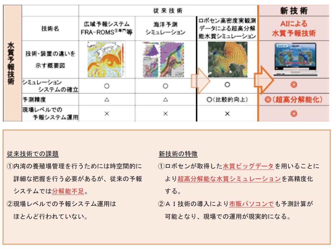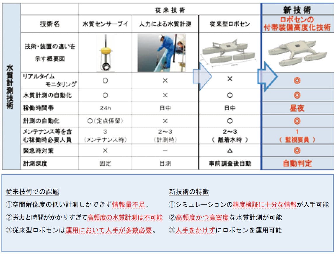 既に著者等はロボセンや超高分解能水質シミュレーションの基本的な技術を構築してきました。(文献(1)、(2)に詳細がありますので本稿では割愛します。)表1と表2に従来技術と本事業で構築される新たな技術を纏めます。