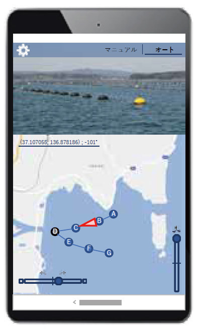 また、PCやスマホ等の端末からロボセンの操縦指令等ができるようにロボセン指令・モニタリング統合アプリを開発します。計測場所、計測時間、計測深度を指定し自動操縦することを指令出来るようにします。端末からカメラデータを見ながら遠隔操船できるようにも研究開発を進めます。(図3)