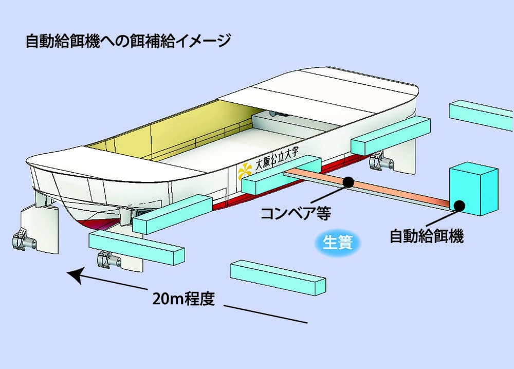- 自動給餌機への餌補給方法の確立・・・ロボット漁船が着岸した後、自動給餌機への餌補給が必要となります。粒状物質の搬送はダンプ式、バケットコンベア式、段付きコンベア式、バキュームポンプ、スクリューポンプ等が挙げられます。自動給餌機と連動した餌補給を検討する必要があります。