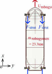 表1にロボット漁船の主寸法と1/7縮尺模型の主寸法を示します。これは図2に示す養殖作業用漁船を参考にしました2)。本ロボット漁船の重要な部分であるストラット形状、ストラット取り付け機構についても設計しました。ストラットの大きさの検討では、簡便な運動方程式を立て、ストラットにより生け簀に着岸する際にどれ程減速効果を得られそうかシミュレーションを行いました。