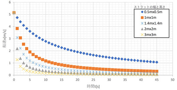 本ロボット漁船の大きな特徴の一つが4つのスラスターと、4つの大きなストラットと言えます。このストラットは、生け簀や港湾施設等への自動着岸時にロボット漁船を減速させるための役割を担っています。これによって凡そ総質量23ton程もあるロボット漁船の慣性力を弱めスラスター制御を容易にすることが出来ます。ストラットのサイズを検討するために簡便な運動方程式を立てロボット漁船が10knotからストラットが生み出す流体抵抗により何秒ほどでどれ程の減速を得られるか求めました。図4に模式図を示します。ストラット流体力は平板抵抗係数1.12を用いています。ロボット漁船の減速の時系列変化を図5に示します。速度低下、船長、喫水深さを鑑みて船長の凡そ1/10の長さ、深さのストラットサイズとしました。図6には製作した1/7模型のストラットの写真を示します。