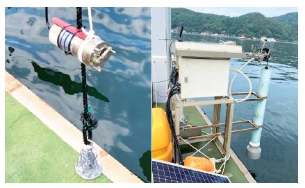 現在、佐伯湾の赤潮初期発生海域で上記2機種を併用してIOT技術を用いた赤潮観測をおこなっています(写真3)。2021年の観測ではカレニア赤潮の発生はなく、発生予察に至りませんでしたが、現場でカレニア赤潮の発生 状況を準リアルタイムで観測できることで、効率的な赤潮監視が可能になっています。また、海洋環境の変化に絶えず曝されている漁業者にとって、連続観測による本機器の監視は漁業生産に安心して取りくむことができる心強い味方として活用されています。
