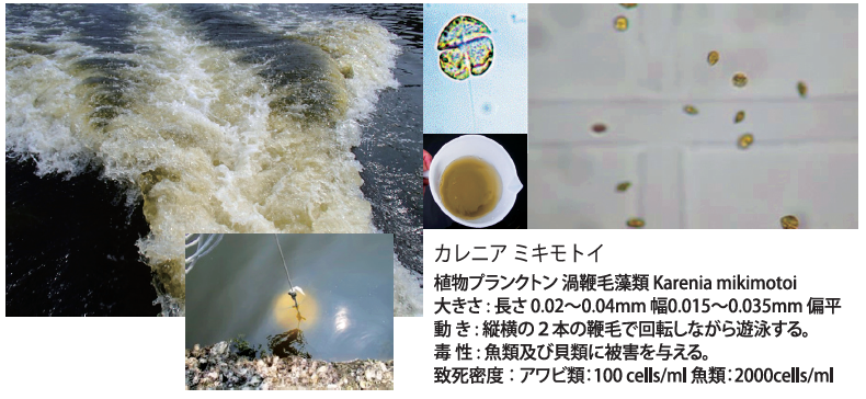 養殖漁業にとって最も大きな問題の一つが 赤潮です。県内の赤潮の発生件数は昭和51年をピークに発生件数は減少していますが、現在も年間 20件前後発生し、天然魚、養殖 魚問わず漁業被害が度々報告されています (文献l)。とりわけ2017年、2018年はこれまで確認されなかった沖合域での羞殖マグロによる赤潮被害が発生し、新たな課題となっています。(写真 1)