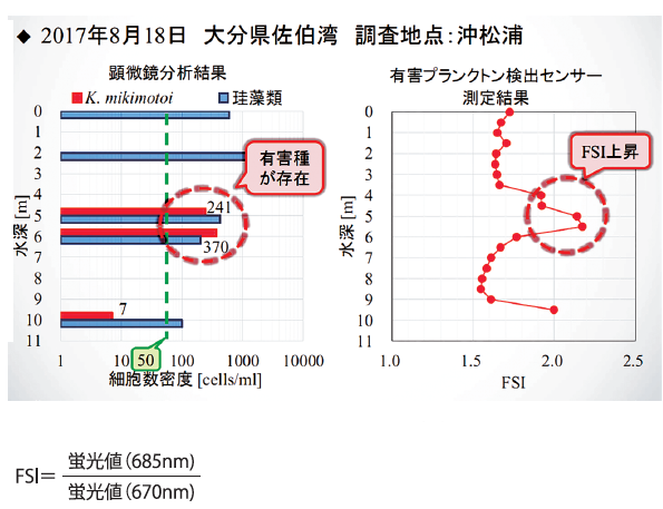 濃密度層を形成する赤潮プランクトン種の特 定には各植物プランクトンが持つ蛍光スペクトルを利用することで種を特定することが可能です。2013年に九州大学の島崎洋平准教授とJFEアドバンテック(株)によってカレニア、ミキ モトイ、シャットネラ、アンティーカ/マリーナの 植物プランクトンが持つ蛍光スペクトルの特異性を利用した、観測機器の共同研究が開始されました。2014年には試作機ができ、2015 年から当水産研究部も参画し現地試験を行ってきました。その結果、2017年に佐伯湾で発生したカレニア赤潮において、中層域のカレニア赤潮濃密度層を検出できることが確認され(図4参照)、さらに2020年にはテレメータ式の定点設置型の観測機を用いて、リモートで低密度カレニア赤潮(27cells/ml)が検出できることが確認されました(文献3)。以上、観測機器によるカレニア赤潮の特定が可能になりました。