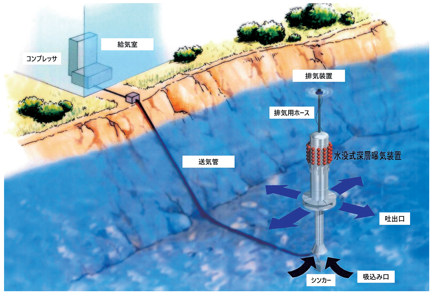 深層曝気装置とは、貧酸素化した深層部に酸素を供給することで深層部の貧酸素化を改善する装置です。本装置は、コンプレッサ、送気管、シンカー、深層曝気装置本体からなります。コンプレッサは陸上部に設置し圧縮空気を深層曝気装置まで送気管を介して送り、空気は上部の排気用ホースを介して排気装置から排出します。深層曝気装置は湖底に設置したシンカーにより本体を強制的に水中に沈ませた状態です(図1)。
