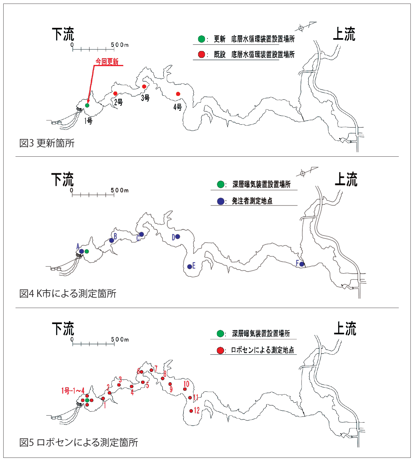 また、今回深層曝気装置を更新したSダムは中層と底層の間に取水口があり、そのため底層・中層の水質改善を重点的におこなっているダムです。今までは深層曝気装置が4台設置され、運用されていましたが、今回は堤体前の1台のみを更新し、更新機器の性能を確認するために、その他の3台は停止させた状態で効果検証を実施しました(図3)。