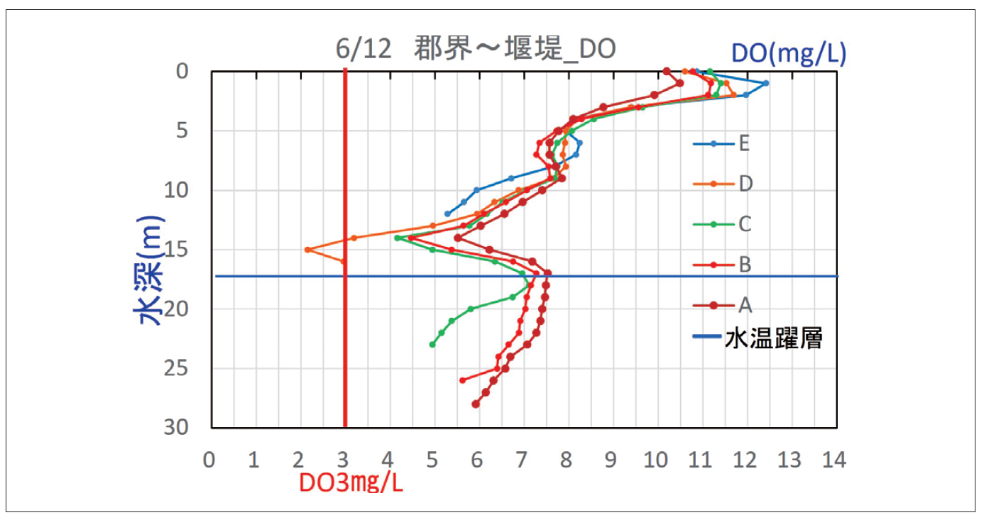 ダム貯水池では春先から夏場にかけて、直射日光や気温の変化により水温が変化し、水温躍層が形成されます。水温躍層とは、太陽により温められた表層水と冷たい深層水の間に存在する、水温が急激に変化する層のことです。水温躍層を境にして浅層、中層、底層では密度が大きく異なるため、水の動きが無くなり、表層の酸素を含んだ水が底層に供給されなくなり、底層ではバクテリアによって酸素が消費されていきます。この現象を深層部貧酸素化といいます。深層部貧酸素化は魚の斃死、硫化水素やカビ臭の発生、底泥からの鉄、マンガンの溶出、リンの溶出、窒素濃度の上昇、水質の悪化、貯水池の着色や異臭の発生を引き起こす原因となります。弊社では深層部貧酸素化に対して、深層曝気装置の設置を推奨しています。ここでは、Sダムに深層曝気装置を導入し、大阪公立大学 工学研究科航空宇宙海洋系専攻の二瓶先生監修のもと日本海工㈱様のロボセンを用いて深層曝気装置の効果を検証しましたのでご報告させていただきます。