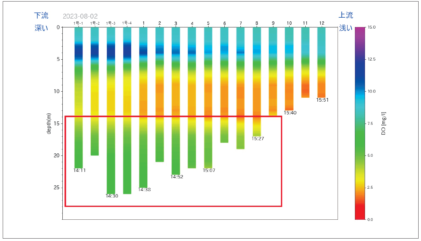 2023年08月02日(水)のDOグラフを図7に示します。グラフの縦軸は水深、横軸は計測位置、配色でDOの濃度を示しています。計測した水温から底層域を割り出し、赤枠で囲っています。底層部は概ねDO3.0mg/(l 黄緑色)を確保できていますが、中層域にDOが低い箇所が確認されます(オレンジ色)。これは、上流側の浅く底層域が無い箇所で貧酸素化が発生し、取水により貧酸素水塊が下流側へ流下しているためです。これにつられて底層部に一部DO低下がみられるものの、全体的にDO3.0mg/l以上を確保することができました。