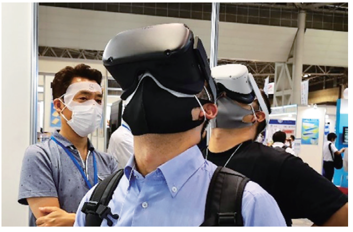 広島県立総合技術研究所では、VR/AR技術の水産・養殖業への利用についてと、PEパイプ製かき養殖筏(PE筏)とトレー式養殖について出展させていただきました。VRでは、牡蠣養殖筏の上空からドローンで空撮した全方向動画を視聴する体験を提供。多くの方にVRの利用について考えていただく機会を得ることができました(図2)。PE筏とトレー式養殖については、生産者の方の他に多くの支援機関や行政の方に興味を持っていただき、その後の普及活動に繋がっています。