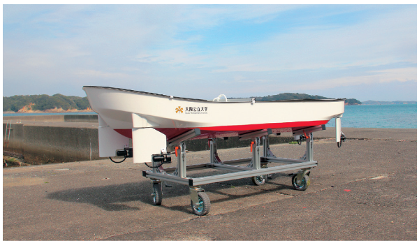 大阪公立大学ではロボット漁船を2021年度から研究開発してきました。有給餌養殖業における大きな課題の一つに漁業労働者の労働負荷というものが挙げられます。自動給餌機は餌やりの労働軽減に一定の役割を果たしますが、30~40個程の生け簀を保有する養殖事業者が1つの給餌機約300kg~400kg程度の補給を週に3、4 回程度行ってます。つまり毎回9 ~12tonの補給を人力で行っています。この課題を解決するためにロボット漁船を研究開発してきましたのでロボット漁船の1/7モデルを展示しました(図3)。
