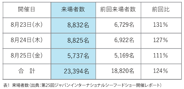 2023年の出展者数は600社(前回570社)、出展ブース数で1,267小間(前回930小間)、来場者数は3日間で23,394名(前回18,820名)となり、出展者、来場者ともに大幅に増加しました。2022年の開催でも会場内は大変盛況の雰囲気でしたが、2023年は海外からの来場者も相当多く見られ、前回にも増して盛況な展示会となりました(表1)。
