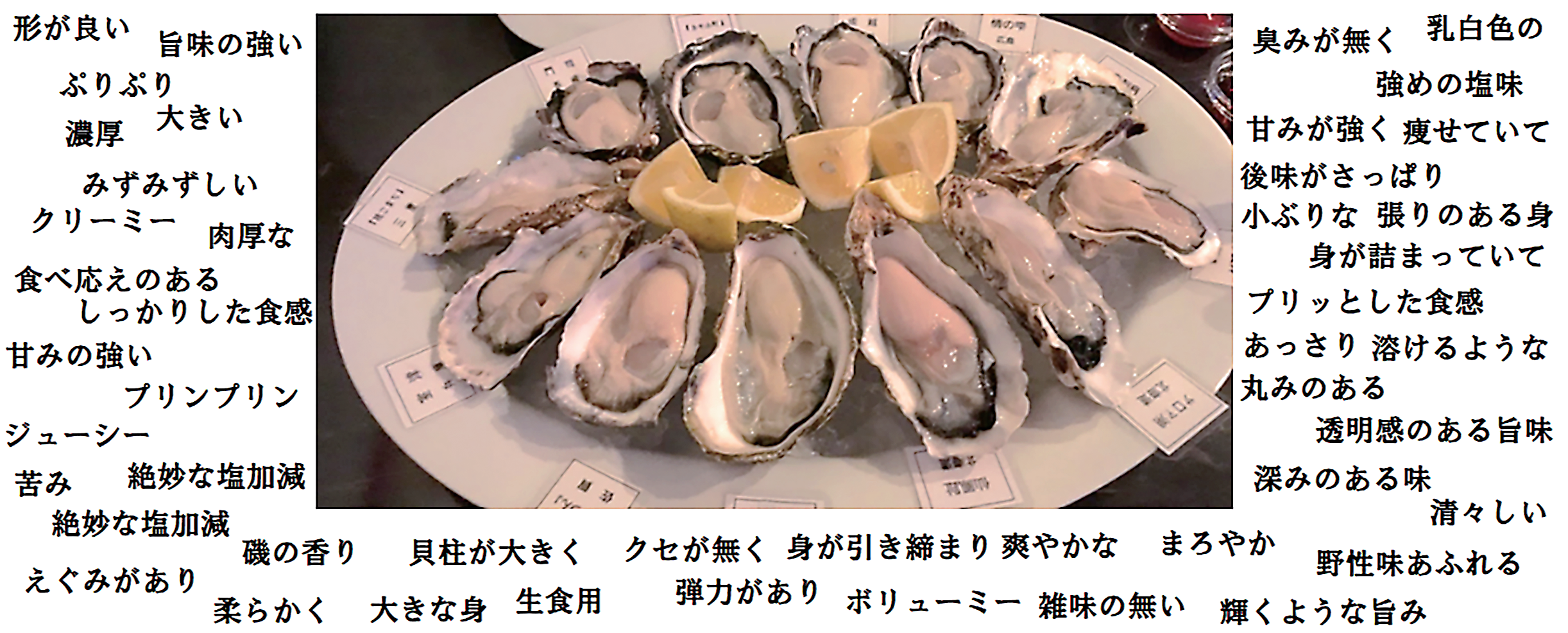 では、皆さんの好みの牡蠣はどんな牡蠣ですか?大きい?小さい?ぷりぷり?瑞々しい?磯の香り高い?あっさり?濃厚?牡蠣の商品を紹介するワードは様々あります。現状の牡蠣を扱うECサイトなどでは、これらの「主観ワード」が飛び交い、牡蠣の特徴を紹介しています。ではどれくらい?他と比べてどれくらい強くその特徴を示しているのかなどの情報はありません。つまり、どの産地のどの銘柄の牡蠣も、届いてみないと、いいえ、食べてみないとその特徴は分からなかったのだと思っています。