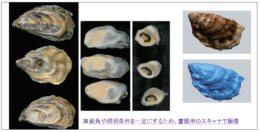 評価は客観的なデータに基づく必要があります。牡蠣の味(旨味、甘味)に関与することが知られている物質としては、グリコーゲン、遊離アミノ酸、特にグリシン、アラニン、スレオニン、セリンなどの物質がありますが、いずれの物質も分析による数値化が必要で、これらの分析に必要な時間、コスト、専門知識のある人員などがネックとなり、現場でのリアルタイムでの数値化には不向きです。また、味覚を直接的に評価する「味覚分析装置」というものも開発されていますが、分析装置が非常に効果高価であること、前処理などに専門知識が必要なこと、高額な消耗品が必要であることなどから考えて、それぞれの生産現場への導入は難しいと判断しました。この経緯を経て、なんとかこれらの分析を回避しつつ、客観的であると利用者に認められる指標はないかと考え、画像認識技術を利用した分析手法を開発することとしました。つまり、出荷中の牡蠣の写真を生産者に撮ってもらい、その写真の特徴から商品評価値を算出するシステムを開発します(図3)。