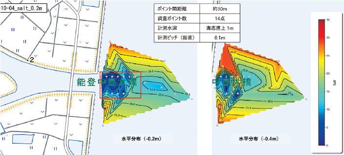 図3の事例は、降雨直後の河口付近において約30mの間隔で観測点を設定したときの塩分の分布を示しています。水面から-20cmの河口前では塩分がかなり低くなっており、扇状に高くなっていることが分かります。また、水面から-40cmにおいては、その分布の様子が異なってきていることを確認することができます。