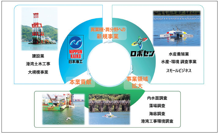 港湾土木工事は、会社設立以来続いている弊社の主力事業で、ロボセン開発の創案は自社が施工する港湾土木工事における付加価値向上、他社との差別化を目指したことがきっかけでした。大阪府立大学(当時)二瓶先生との出会い、CAINESの皆様の出会いがあり、水産養殖のフィールドで育ってきたロボセンですが、弊社主力事業の分野においてもも貢献できる姿に近づいてきていると感じています。(図5)