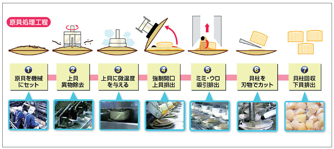 新機構では、刃物による正確な貝柱切り出しを可能にし、欧米市場でも受け入れられる品質を実現。自動搬送、ブラシ洗浄、蒸気処理、ミミ・ウロ除去、特殊ナイフによる切断、貝柱回収までの一連の工程をシーケンス制御により自動化し、1時間で最大5,760枚の処理能力を達成しました。(図3)