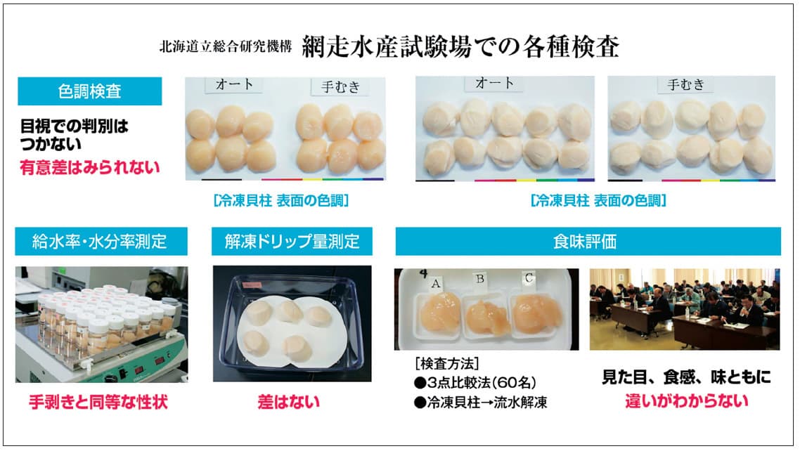 また、品質面においても、網走水産試験場の比較検査により、色、吸水率、ドリップ量、栄養成分、食味評価において、手剥きと機械剥きに違いがないことが明らかとなり、現場からの信頼性も獲得しました。蒸気による貝柱への影響も、人肌程度(38~40℃)でたんぱく質変性を起こさず、吸水率にも影響がないことが公的機関により確認されています。(図4)