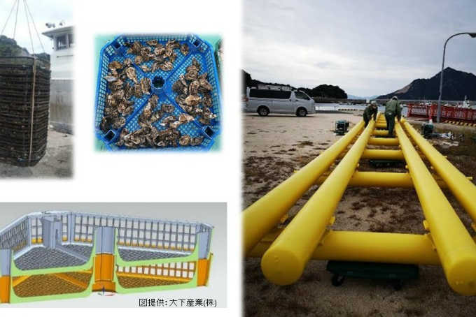 広島県立総合技術研究所は,ポリエチレン(PE)パイプ製のかき養殖筏の開発を企業と共同で行っています。従来の竹製筏の耐用年数は5年程度でしたが,耐候性PEを使用することで40年以上利用可能となる見込みです。また,加工性に優れ適宜の修繕が可能な上,リサイクル可能な資材です。この筏に,トレー式養殖を組合わせ,環境配慮型で持続的なかき養殖システムを目指しています。