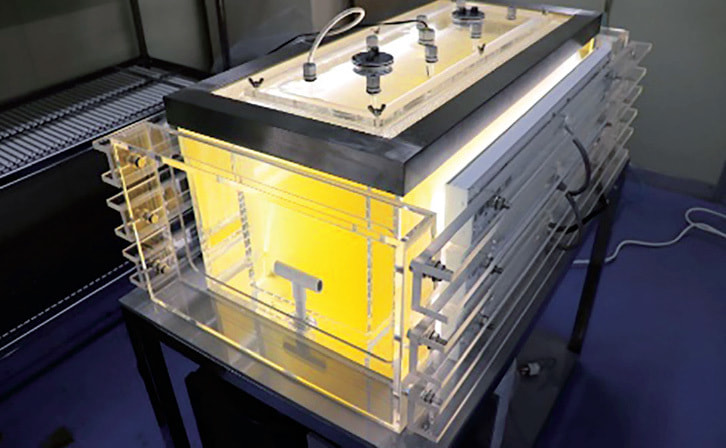 本製品は曝気システムに独自技術を用いており、水槽内の効率的な水循環を実現しています(特許申請事項)。自走性がなく、放っておくと沈殿してしまう種類の微細藻類でも、安定的に培養できます。