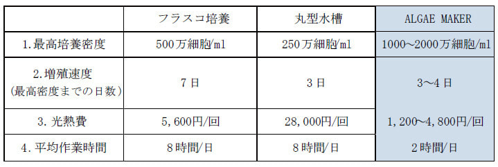 実用化に向けてデモ機を水産現場に貸与して実験していただき、装置の性能を従来の方法と比較しました(図4)。キートセロスの培養において、本製品は従来の方法(フラスコ培養や丸型水槽培養)と比較して4~8倍の高密度培養を可能にし、短期間(3~4日)で1000~2000万細胞/mlに達する高い増殖速度を実現しました。これにより、少量の培養で必要なバイオボリュームを確保でき、培養頻度や培養スペースの削減を可能とするほか、急な餌需要にも柔軟に対応できます。また、培養期間や培養量を抑えられることで光熱費(LED、チラー、ヒーター等)を削減し、培養条件を自動調節する機能によって作業時間を短縮できました。(表1)