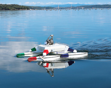 ロボセンの最大の特徴は、4つの船体で構成している点にあります。それぞれの船体に独立して制御可能な推進器と回頭機構を装備しており、この機構によって、4つの船体の推力と回頭角度を個別に制御して自動航行中の針路変更や航路補正を行うため、風波の影響下においても、精度の高い自動航行が可能となっています。