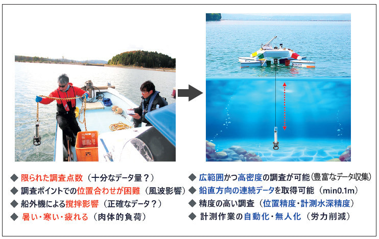 また、さらに新たな適用領域の拡大を図るため、港湾土木工事現場でのデモンストレーションを実施し、施工による水質環境への影響調査や施工後の出来形確認などにも挑戦しています。