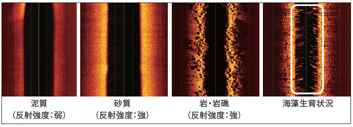サイドスキャンソナーは、音波(音響パルス)を発振して、海底地形の凹凸や立体物に反射する時の、反射強度の違いを色の濃淡で表現します。音波のパルス幅を利用して反射の強弱を取得しているため、細かい起伏や海底面の底質を表現することができ、海底面の底質(岩、砂、泥、浮泥等)の分布を測定することができます。(図4)